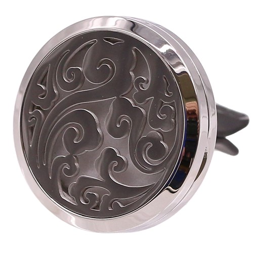 A metal clip that goes on a car vent or fan, comes with a pack of felt discs for you to put oils onto that sit inside the clip. (1" dia)